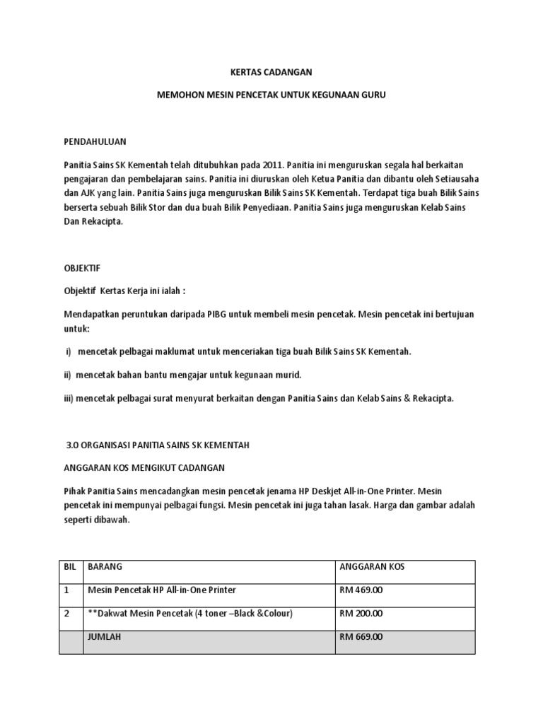 Kertas Cadangan Memohon Mesin Pencetak Untuk Panitia Sains Sk Kementah Fasehah Abdullah Academia Edu